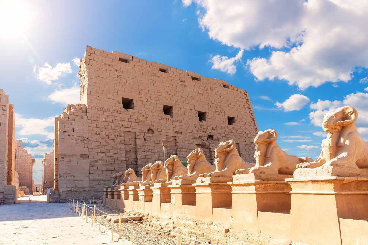 Llegada a Luxor y salida para realizar las visitas del Templo de Karnak erigido en honor al dios Amón y principal recinto de culto en Egipto desde las dinastías que conformaron el Imperio Nuevo y que cuenta, entre otros, con una magnífica sala hipóstila de 23 metros de altura que alberga en su recinto nada menos que 134 columnas y el Templo de Luxor, más pequeño que el de Karnak y comunicado con éste por una impresionante avenida de esfinges con cabeza de carnero, más conocida como la Avenida de las esfinges.